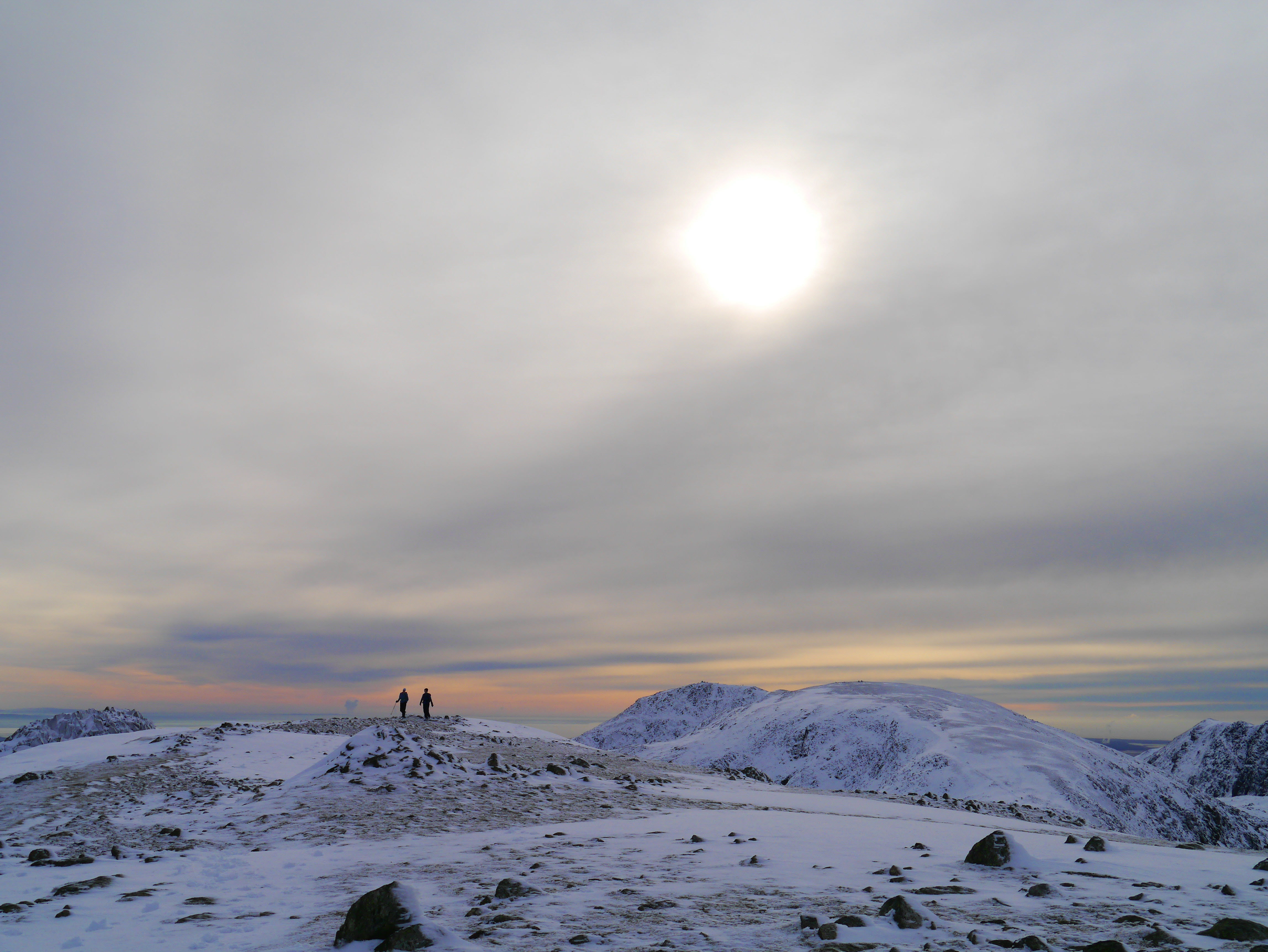 It wasn’t a dangerous ridge walk across to Brim Fell and Swirl How, the cornice was small and easily spotted, and the ground not yet iced up enough to make walking difficult, trekking poles rather than crampons. It was little more crowded on Swirl How, but there was plenty of room beside the summit for a sheltered lunch stop. Last time I was at this spot it was difficult to stand in the gale, which led to navigation problems and a hasty retreat down Prison Band. Today the band was more alpine, and fun to descend, the snow providing a soft hold for the feet, and almost an easy glissade in places.