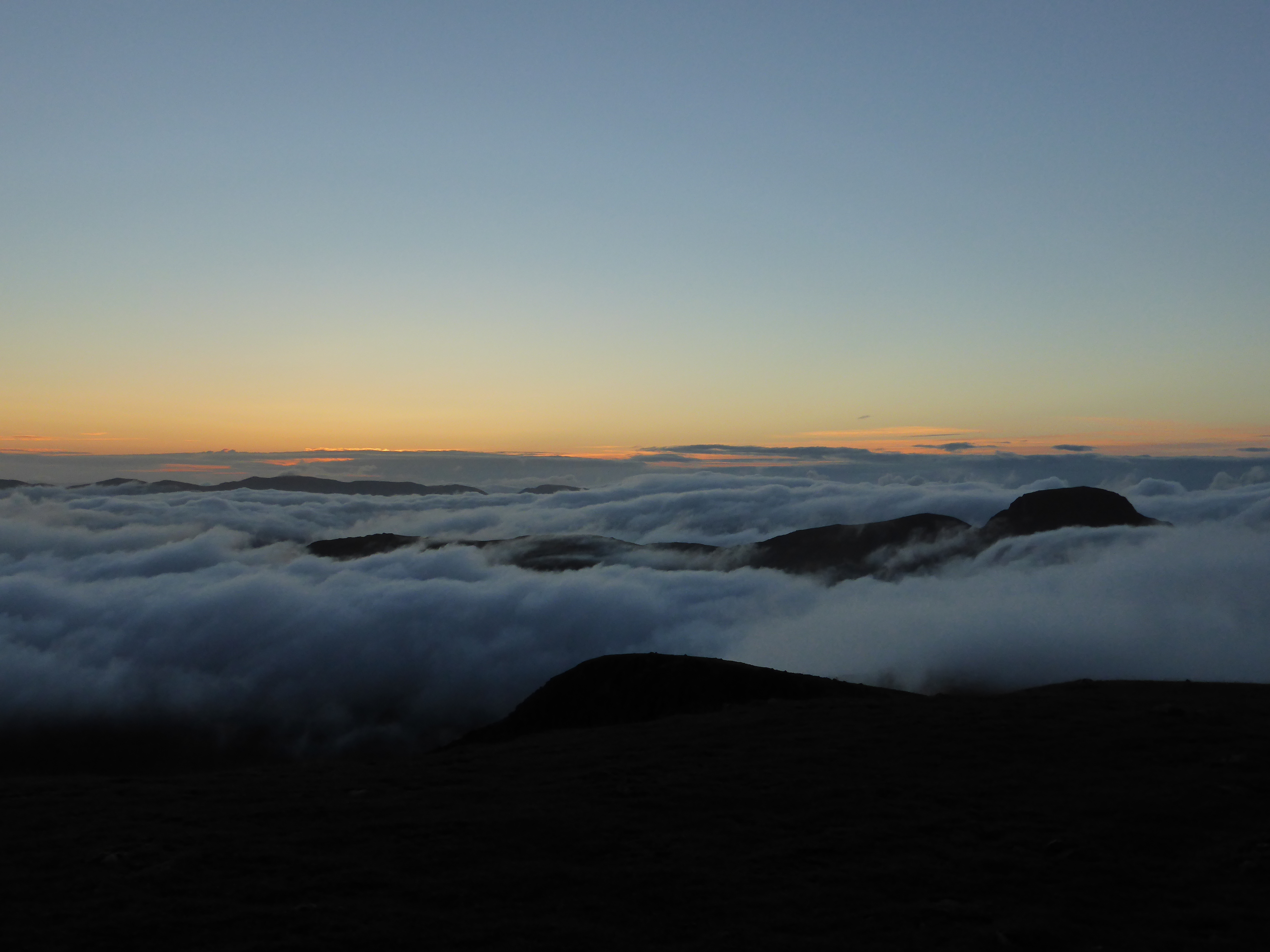 By the time I struggled to the summit, I was exhausted and it was getting dark. I spotted what must be the best wild camping spot in the country, just 10m from the trig point, a rock free, tent sized level bit of ground, mainly surrounded by a low wall windshield.