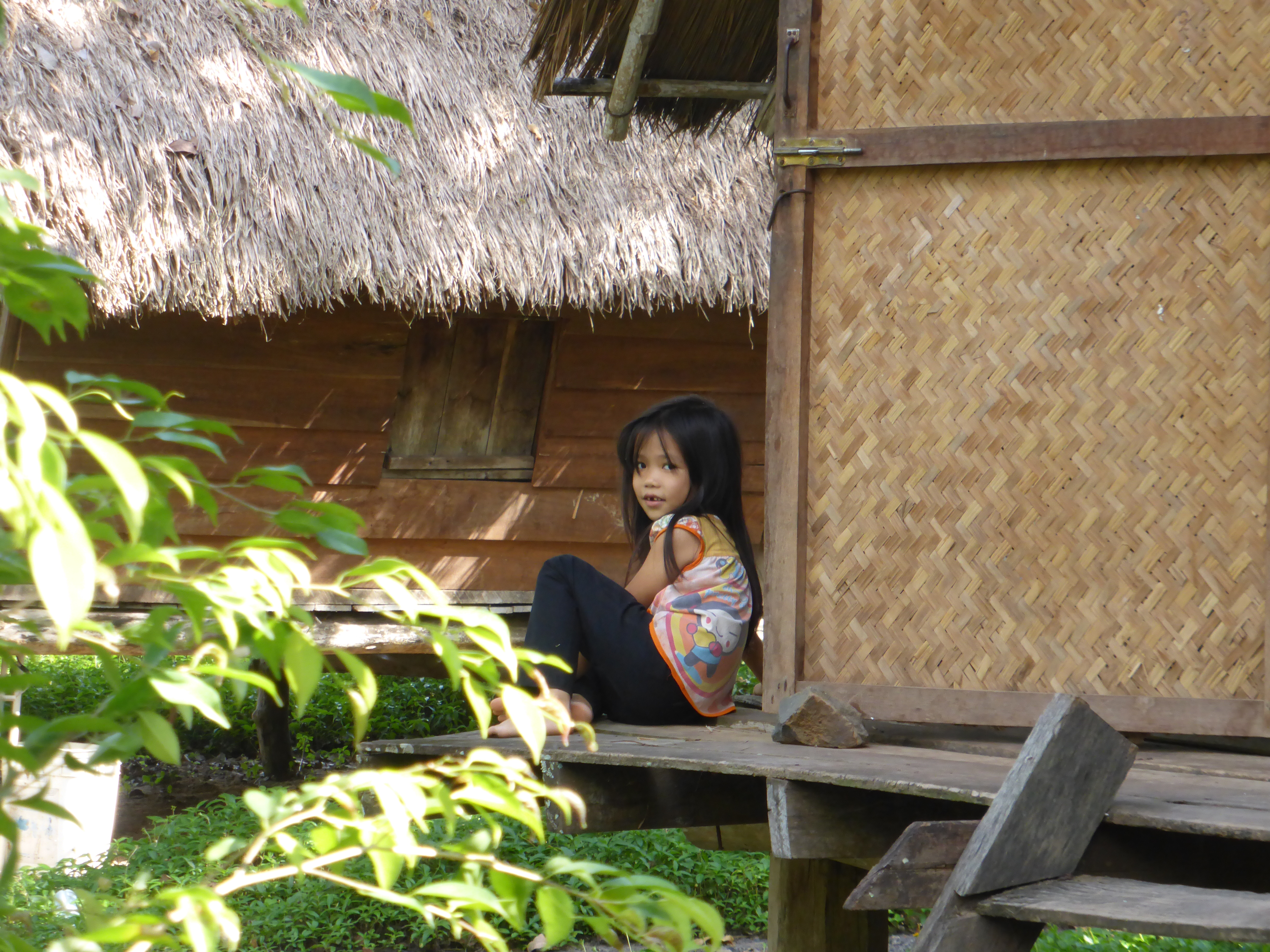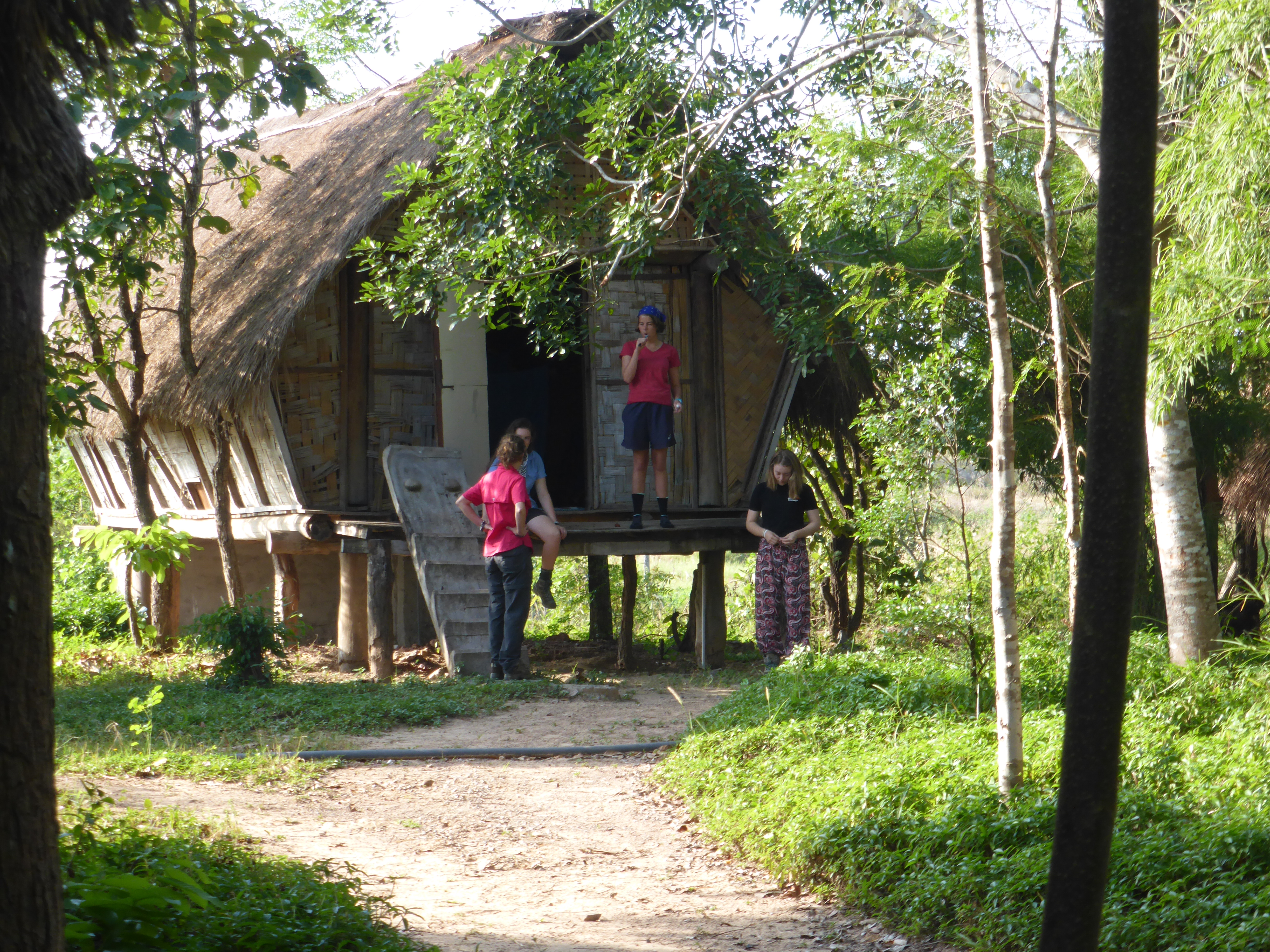 After a locally prepared lunch of pork kebabs, rice in bamboo and a whole cucumber each, we trekked along the track following the river until we met the canoe again, to be ferried upstream weaving through some islands to our next overnight stop. Arriving at a landing point, we were met by another elephant, waiting to shake our hands and take other tourists around the resort. This was Ban Don resort, a sort of made-up village, with a Ede longhouse to visit, and stilt huts to stay in. All of our huts had resident frogs and geckos to keep the other wildlife under control, we tried to chase them out but they quickly retreated into holes in the bamboo raffia walls. The resort was a bit contrived, but fun.