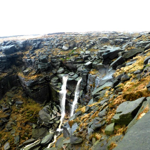 The gales got up as we did the final climb onto the Kinder edge so we took the opportunity of stopping for a mix and match lunch in the small gully around Sandy Heys. Kinder downfall had a lot of water going over it, but despite the strong southwesterly, the waterfall wasn’t doing its famous reverse fall. Beyond the downfall it stopped raining, the wind dropped and the cloud lifted slightly, so we could see across to Manchester. An airport runway was clear in the distance, but on checking it appeared to be Woodford rather than Ringway International Airport..