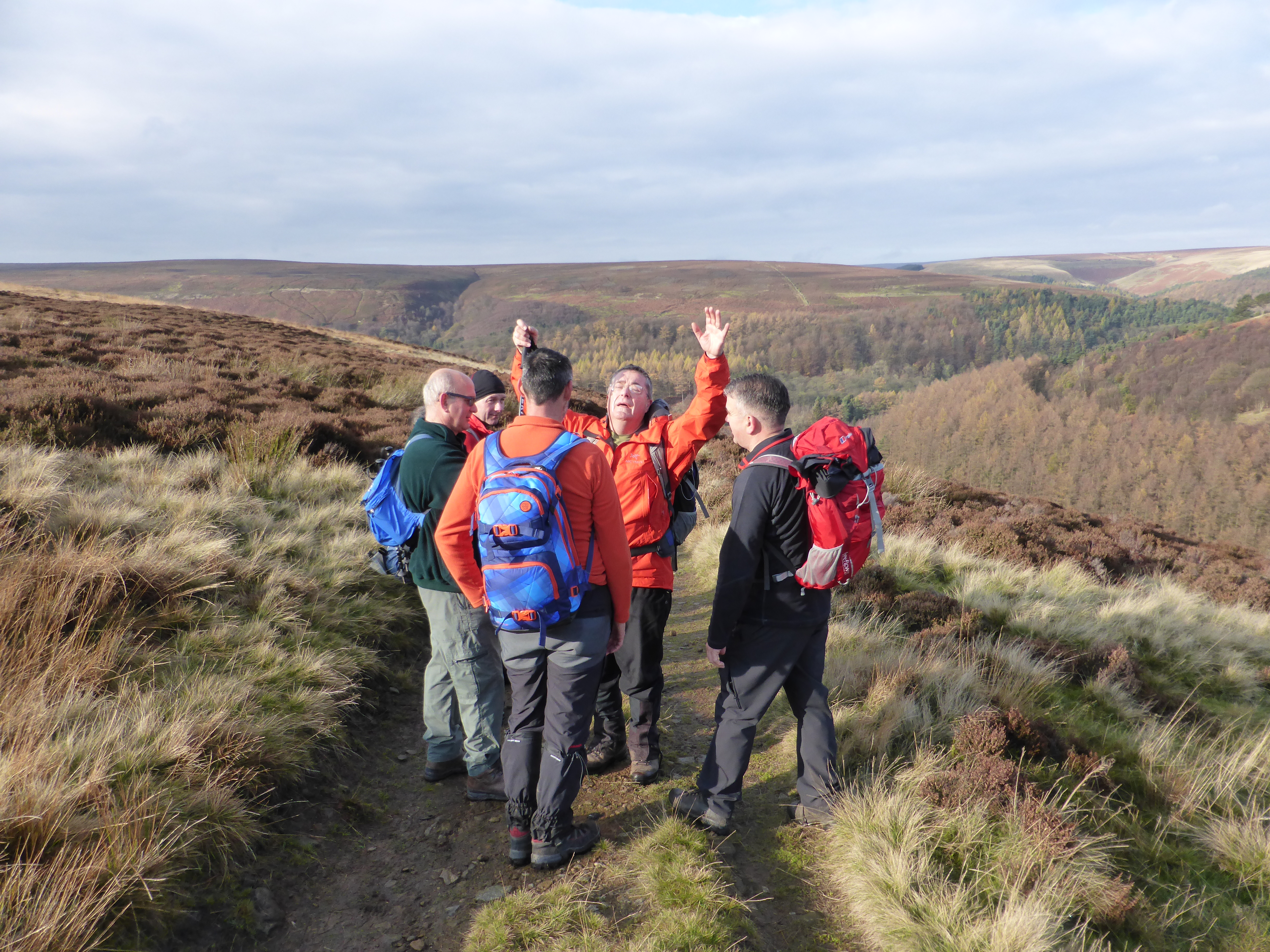 It was time to break open the cake tin when we arrived at Lost Lad viewpoint. Rachel’s tasty chocolate cake was dutifully shared out, and there was enough for a second helping. Great, enough to keep us going until lunch. Lots of fun was had playing with the panorama app on Steve’s iphone and we tried to get into the picture twice. This worked much better than yesterdays attempt on Kinder Downfall.