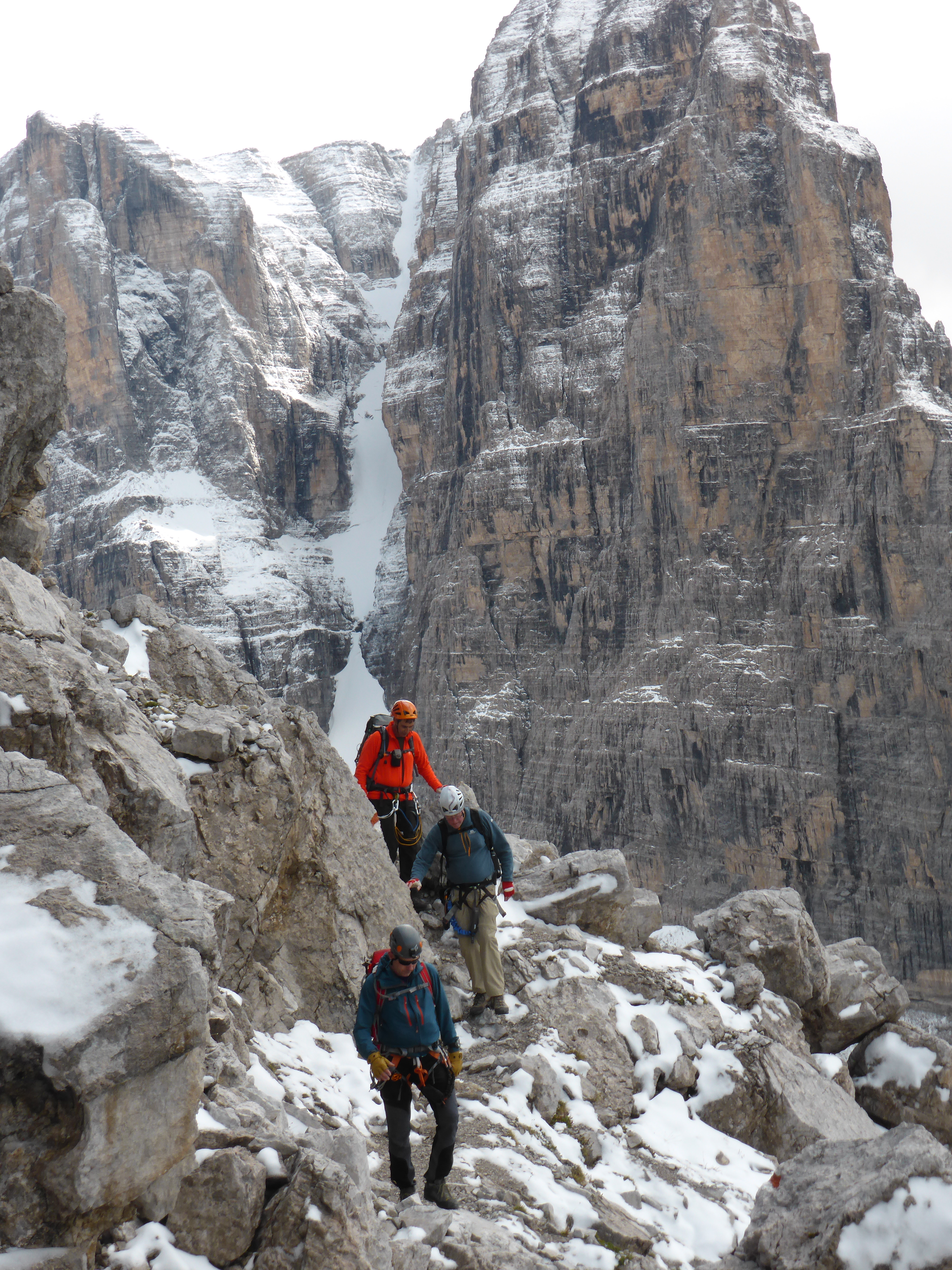 It’s important to get expedition dates and destinations agreed early. Recently we have struggled to get our group together for a trip abroad. Last year I was laid up after my operation – so it was just Steve and Mike. The year before we just couldn’t seem to get the whole thing together. So this year we all tried harder and six people signed up for a return trip to the Dolomites. Mike wanted a return to the spectacular ledges of the Brenta; I suggested a hut to hut trip; others were just keen to get away with friends and enjoy an Alpine trip. And so the six of us finally met up in an airport hotel in Munich, most of us starting the road trip a day before in Manchester or London. Soon the Discovery was full of gear and people as we set off back to the Brenta.