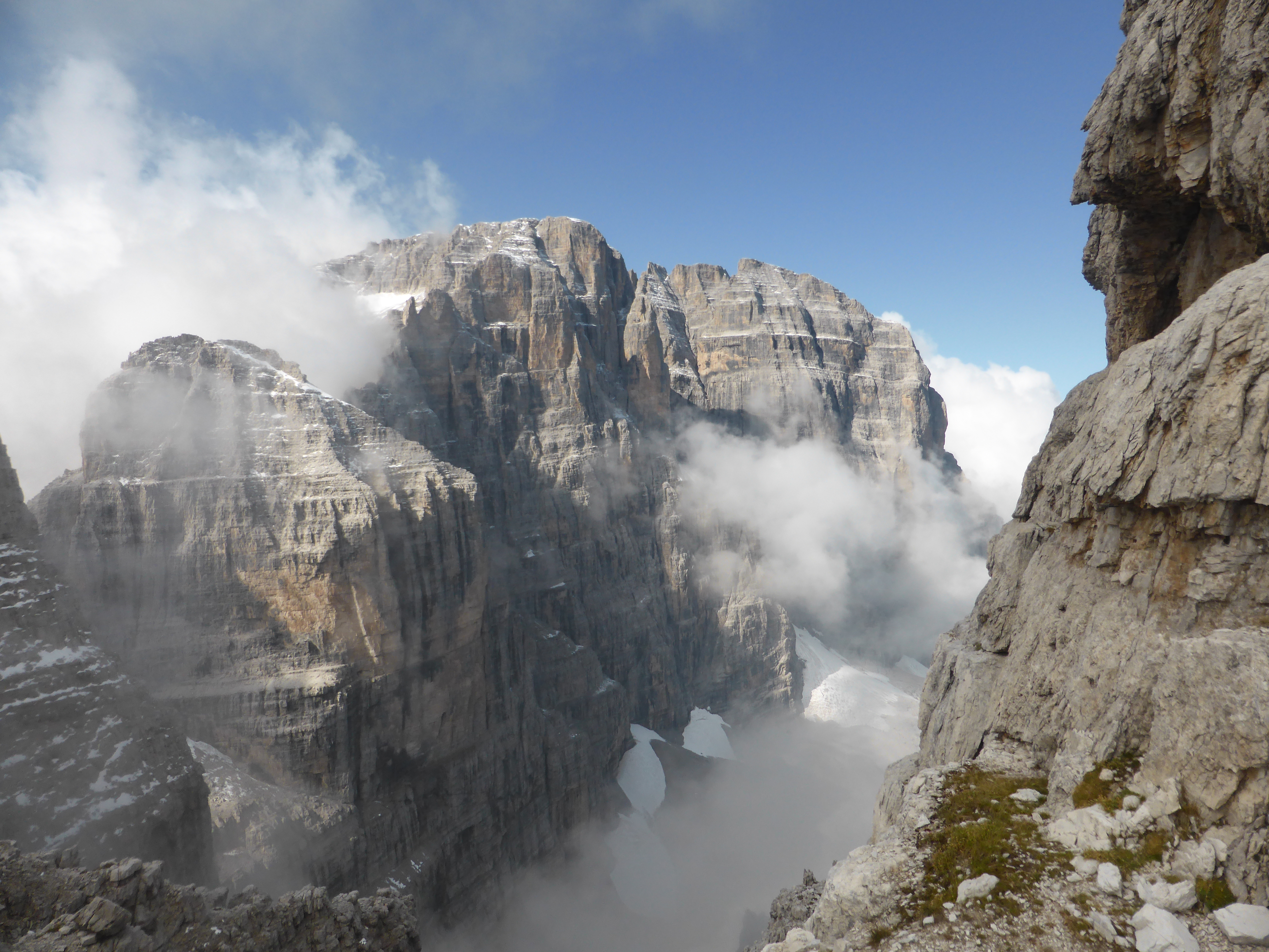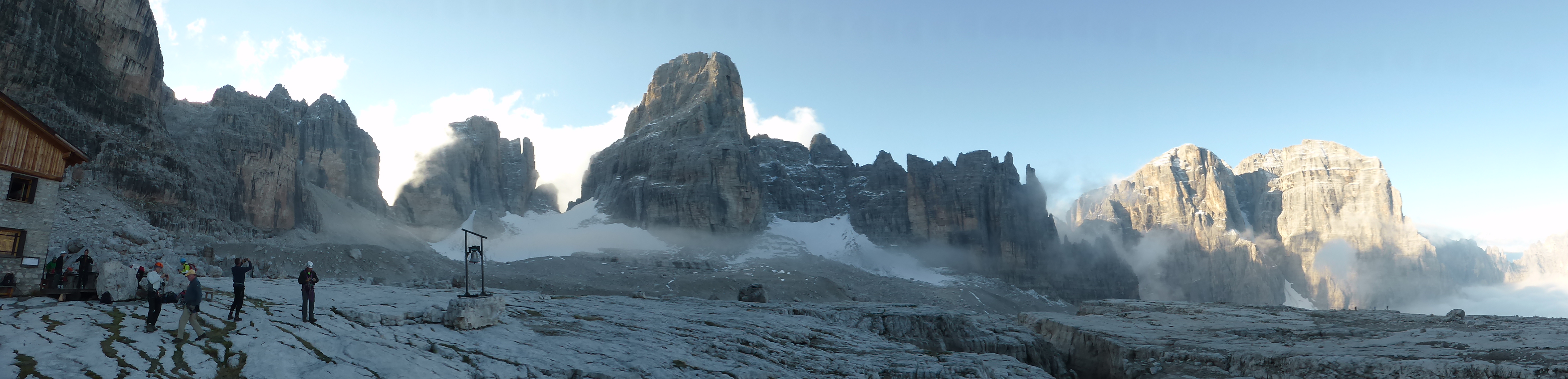 Next morning was misty, which started to clear over breakfast, (the same old bread, Jam and weak tea again). Gaps in the cloud started to reveal sun not far above us. Out of the window we could see photographers grouped on the edge of the flat rock area in front of the refuge, waiting for the mist to clear. As the mist drifted by the vertical cliffs of the spectacular Cima Tosa and a stunning panorama of the whole Brenta Alta valley was revealed.