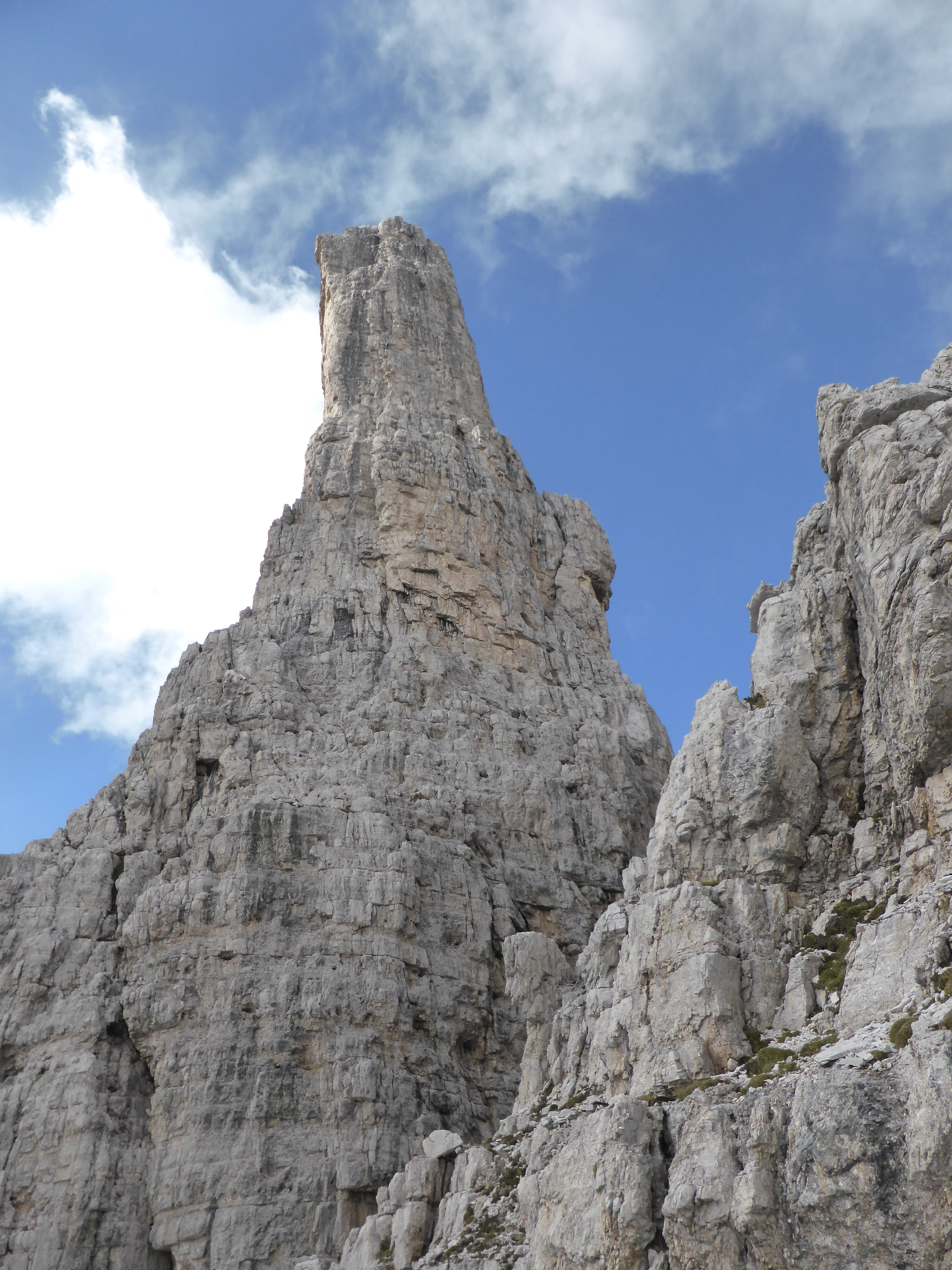 As we edged along the ledge between Campanile Alto and Basso we heard a helicopter, then a scream. Rob and Dick looked to see a BASE jumper plunge down from Campanile Basso. It was scary just being there, but not as much as the video of the actual jump. You can probably see us at the beginning if you zoom in.