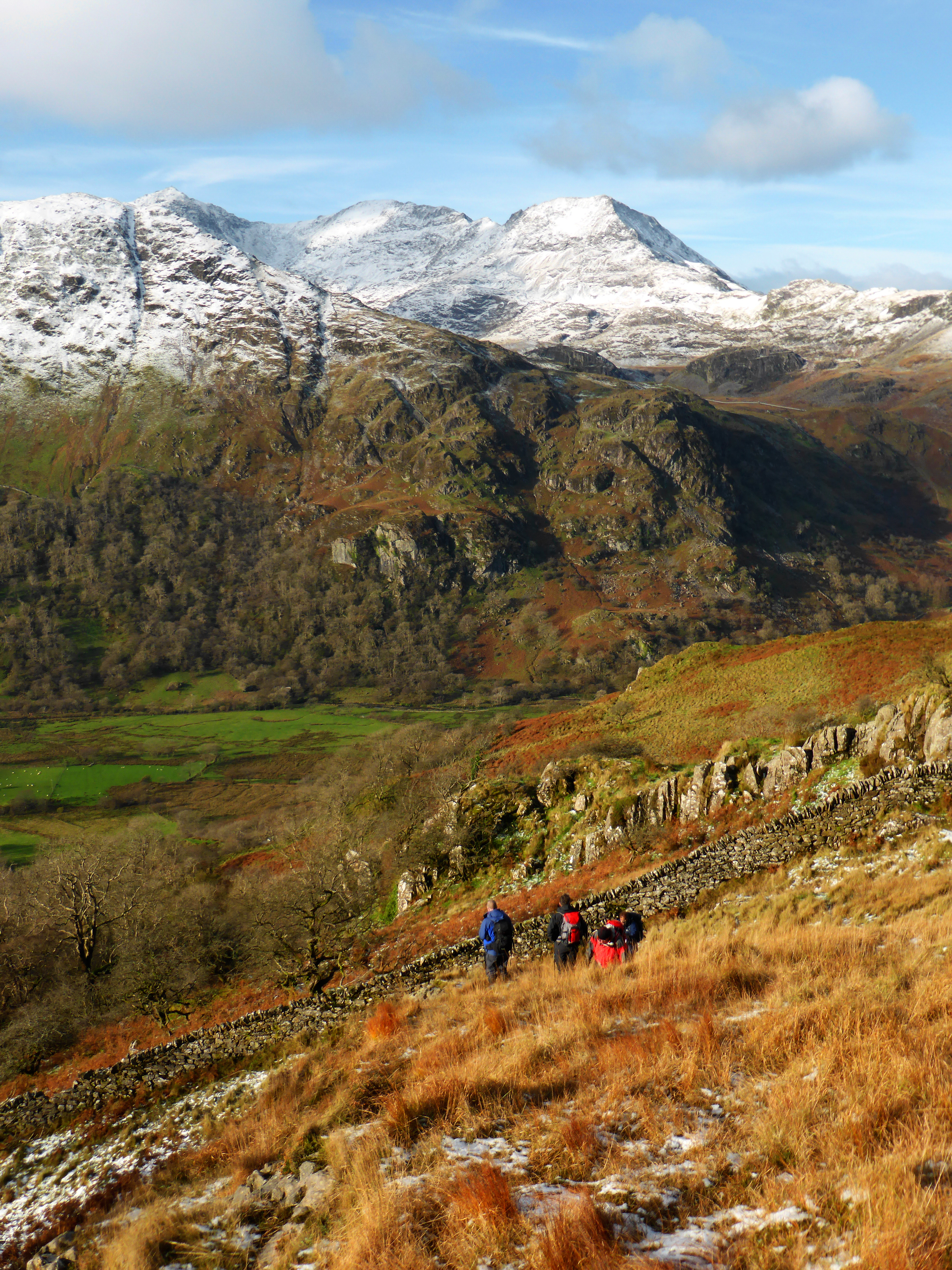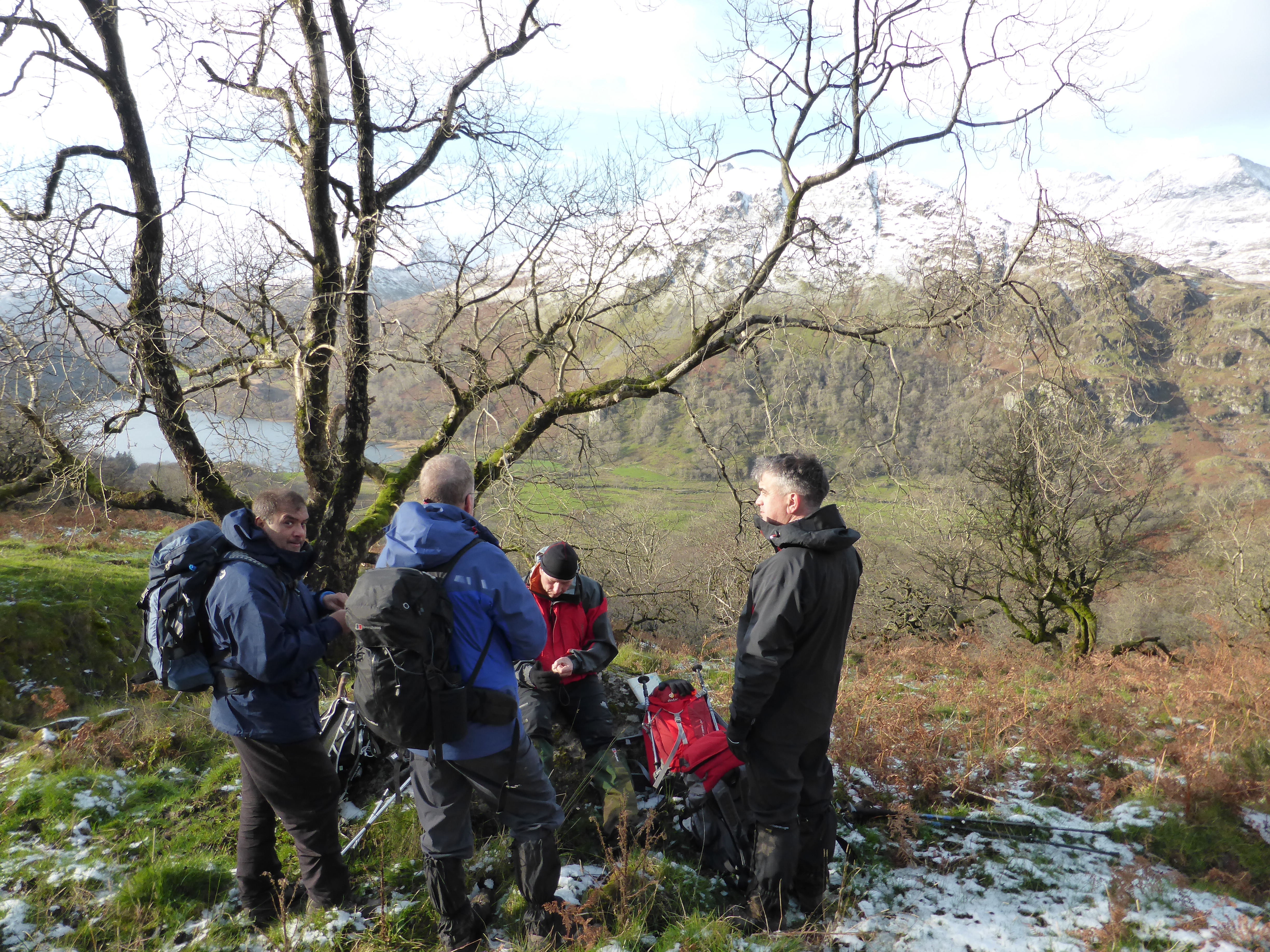 That night, the hostel roof rattled. Gales, snow and heavy rain passed over Snowdonia during the hours we were tucked up in our bunks. Morning never really came, it was dull, blustery with snow covering the road. We left the heights of Snowdon to the Saturday crowds and headed down the Pyg track, branching down again to the hydro power station at Gorsaf bwer. This is a lovely pleasant valley, fading brown bracken and gentle forests covering the slope down from Snowdon. Delightfully sheltered as we strolled along the old road to Llyn Gwyany. Nattering away, putting the world to rights, it was only after we hit the main road did we realise we had missed our turn off up the hill. Bill set off around the Llyn in search of the next Tea and Cake shop while we headed back along the road to find our path up the hillside above us.