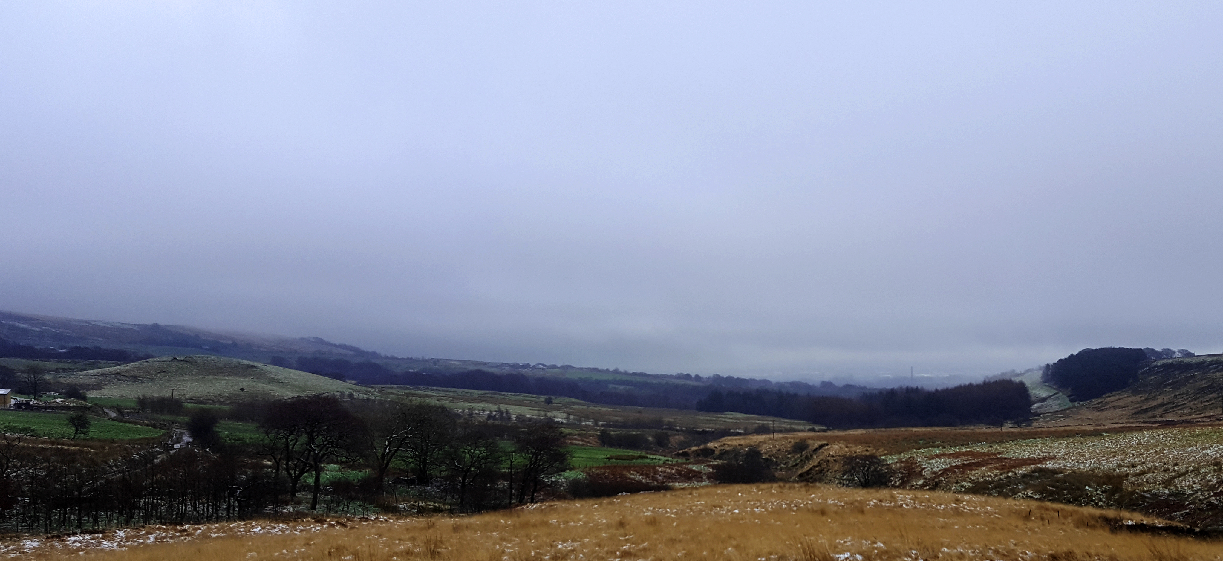 Smithills Woodland Trust Estate. Burnt Edge to right, Sugar Loaf to left. Barrow Bridge Chimney just visible through the mist.