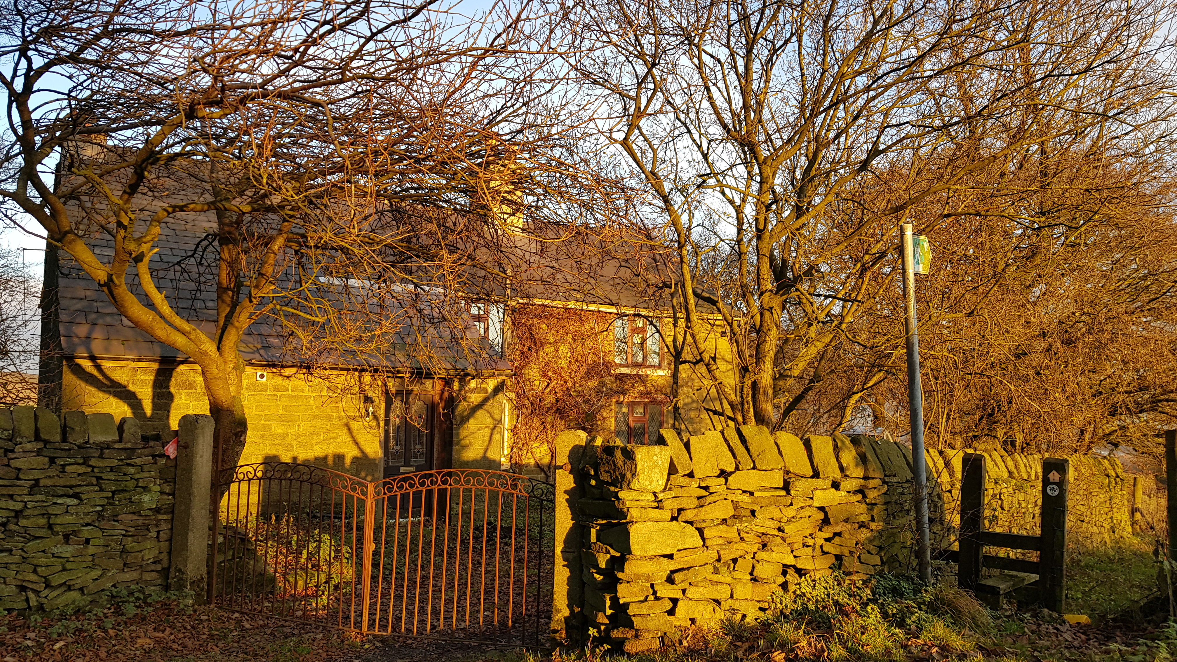 Yesterday afternoon we took the dog up Burnt Edge from Walker Fold, catching the last of the sunshine before returning to the new Woodland Trust Car Park through New Fields farmyard. This is a rundown farm, with disused vans abandoned around the yard and untidy piles of rubble and rubbish. High above Walkers Fold and Dean Brook it was probably part of that farm area. Looking at my 1620 map of the area, it’s shown as new feelde. So its been there at least 400 years. Looking at the state of some of the windows, I think they could be originals.