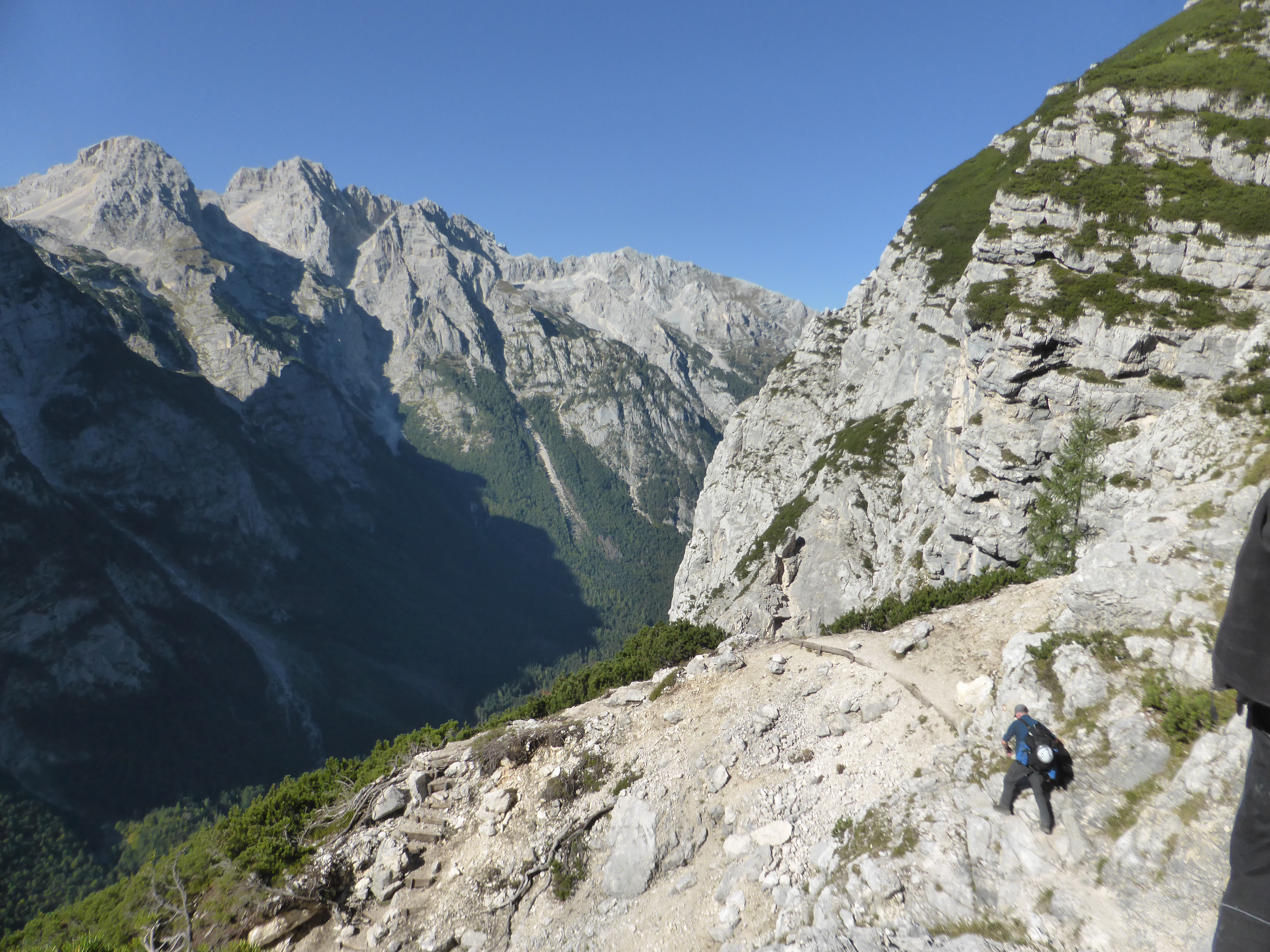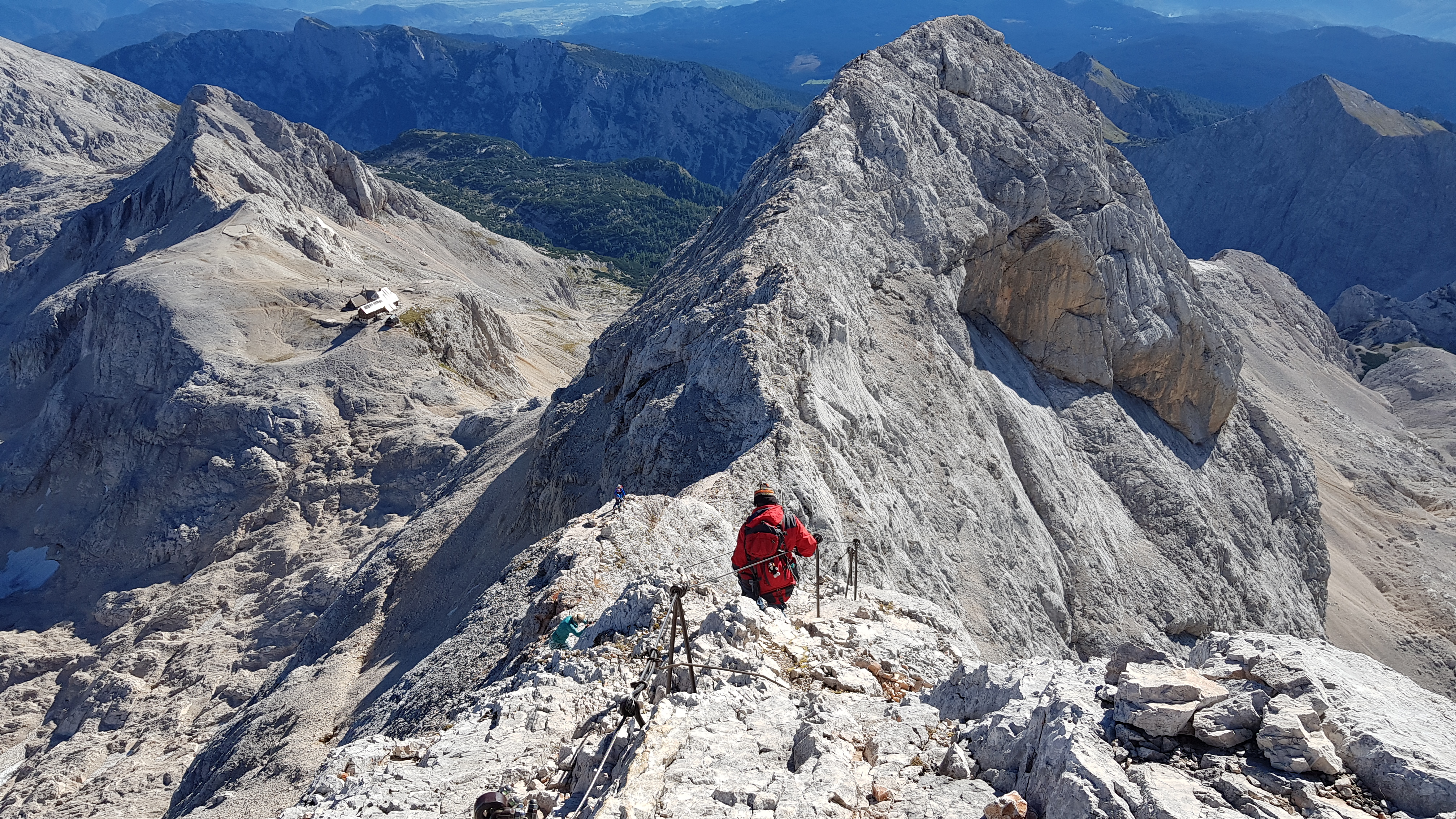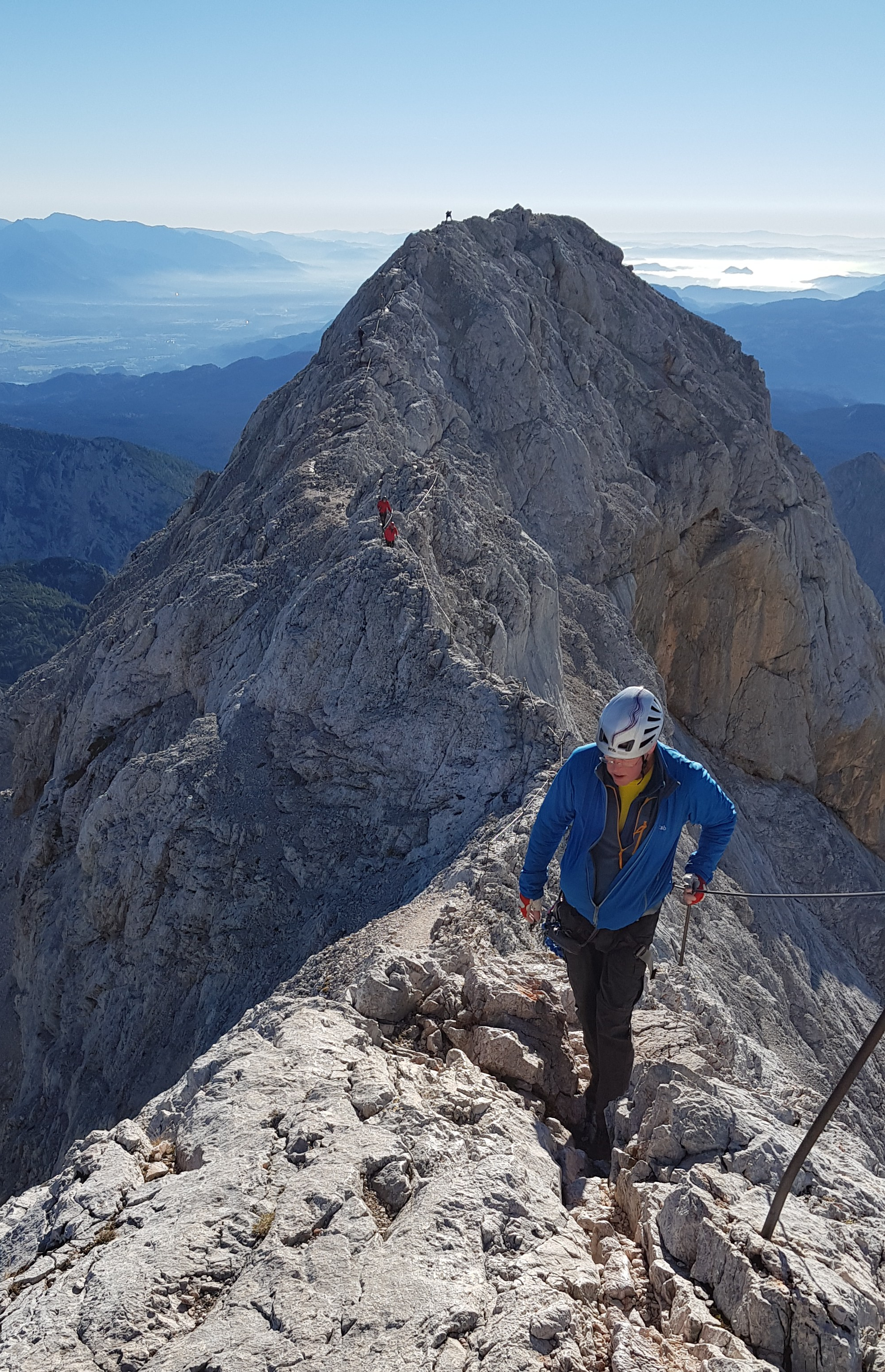Second day of our climb of Triglav last September. After the hard day up to the hut; https://antondotreks.com/2019/01/07/day-1-climb-to-triglav-tominsek-route-to-triglavski-dom/ the next morning it was summit day – yippee. From the hut, the Triglav path took us to the bottom of the buttress holding up of the south summit, Mali Triglav. Then up 350m of steep, exposed face across well-worn rocks – smooth from the many ascents and descents. Wires along the way gave good protection though, most climbers using it as a handrail rather than clipping in.