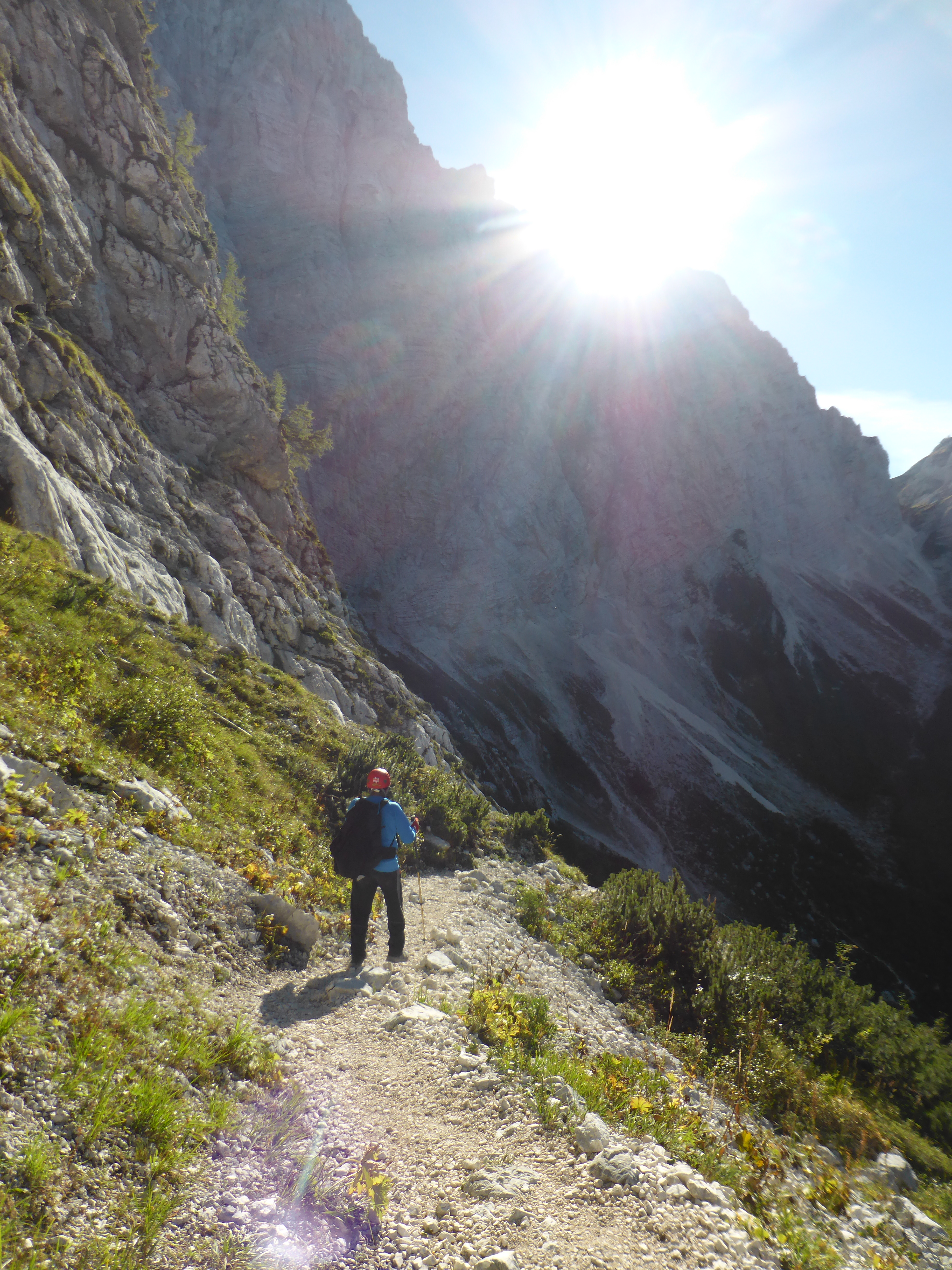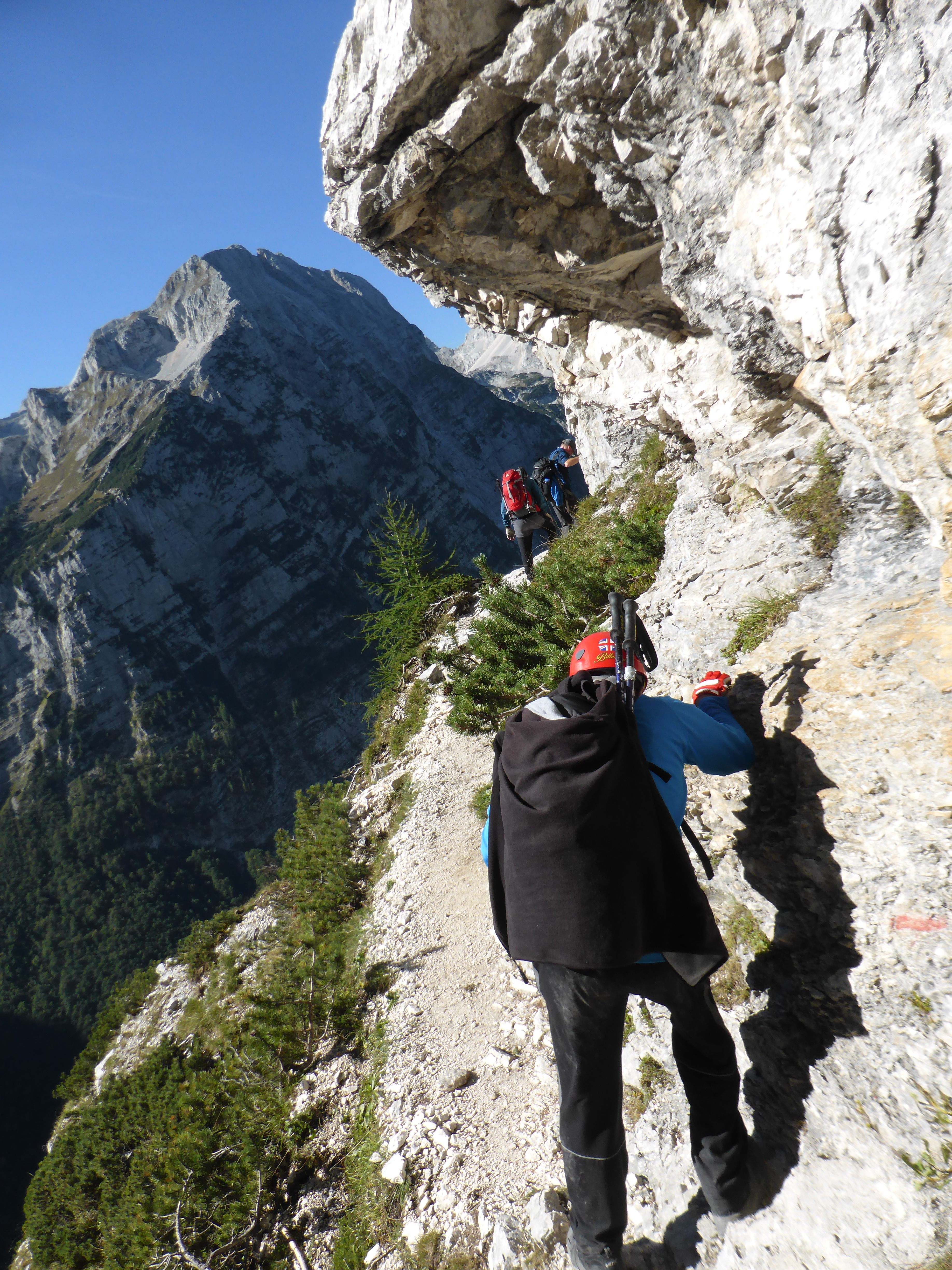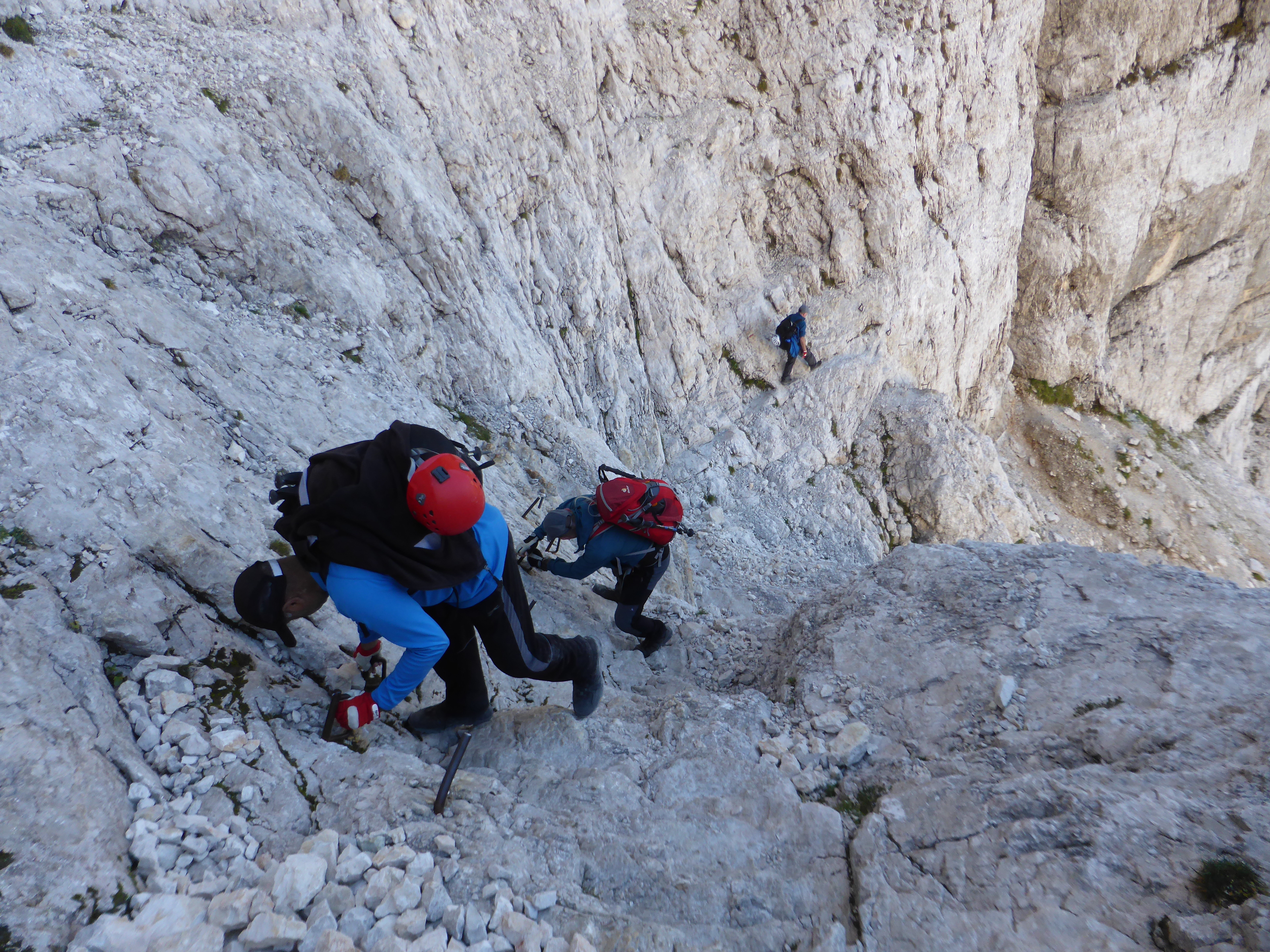 Second day of our climb of Triglav last September. After the hard day up to the hut; https://antondotreks.com/2019/01/07/day-1-climb-to-triglav-tominsek-route-to-triglavski-dom/ the next morning it was summit day – yippee. From the hut, the Triglav path took us to the bottom of the buttress holding up of the south summit, Mali Triglav. Then up 350m of steep, exposed face across well-worn rocks – smooth from the many ascents and descents. Wires along the way gave good protection though, most climbers using it as a handrail rather than clipping in.
