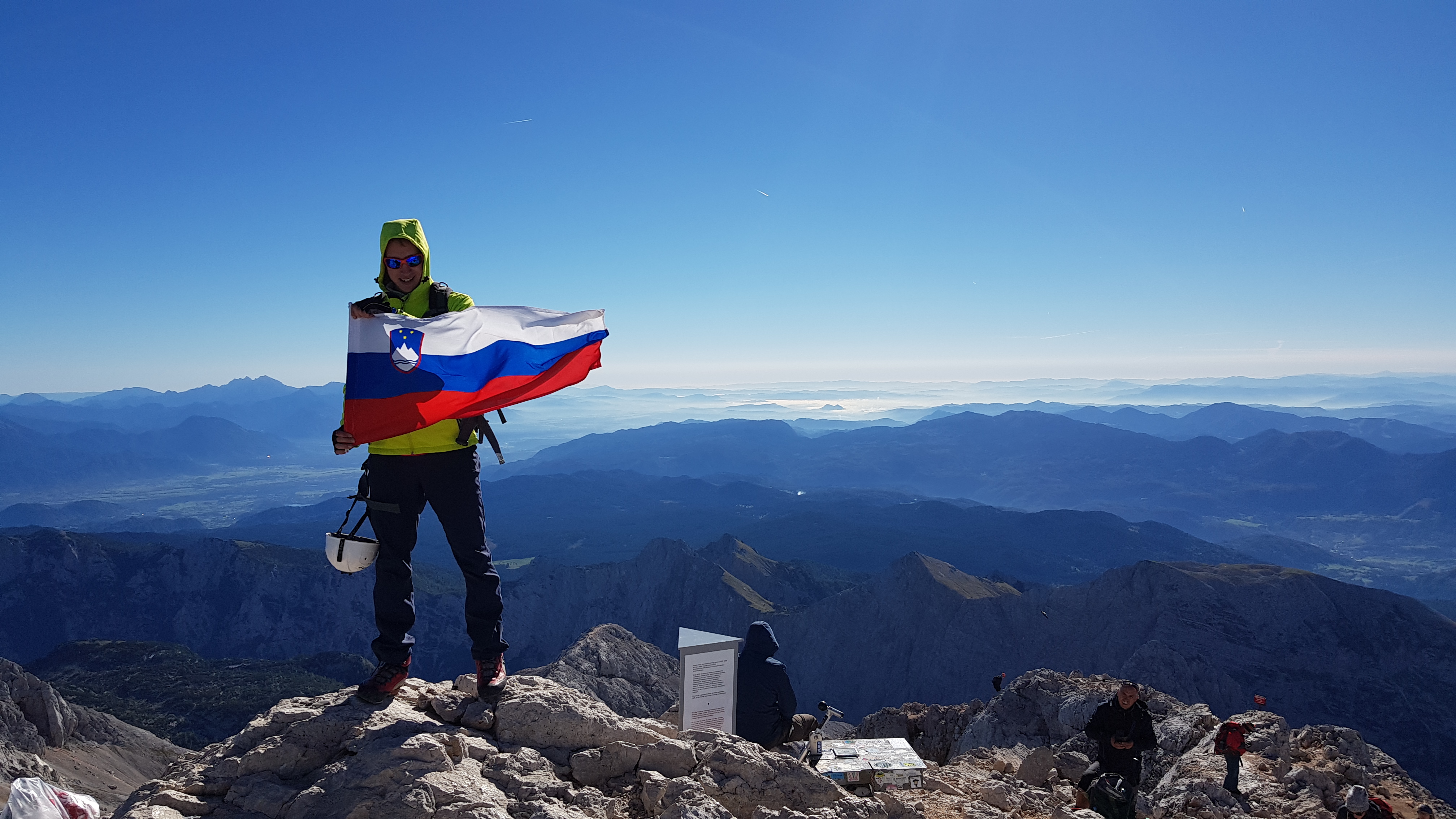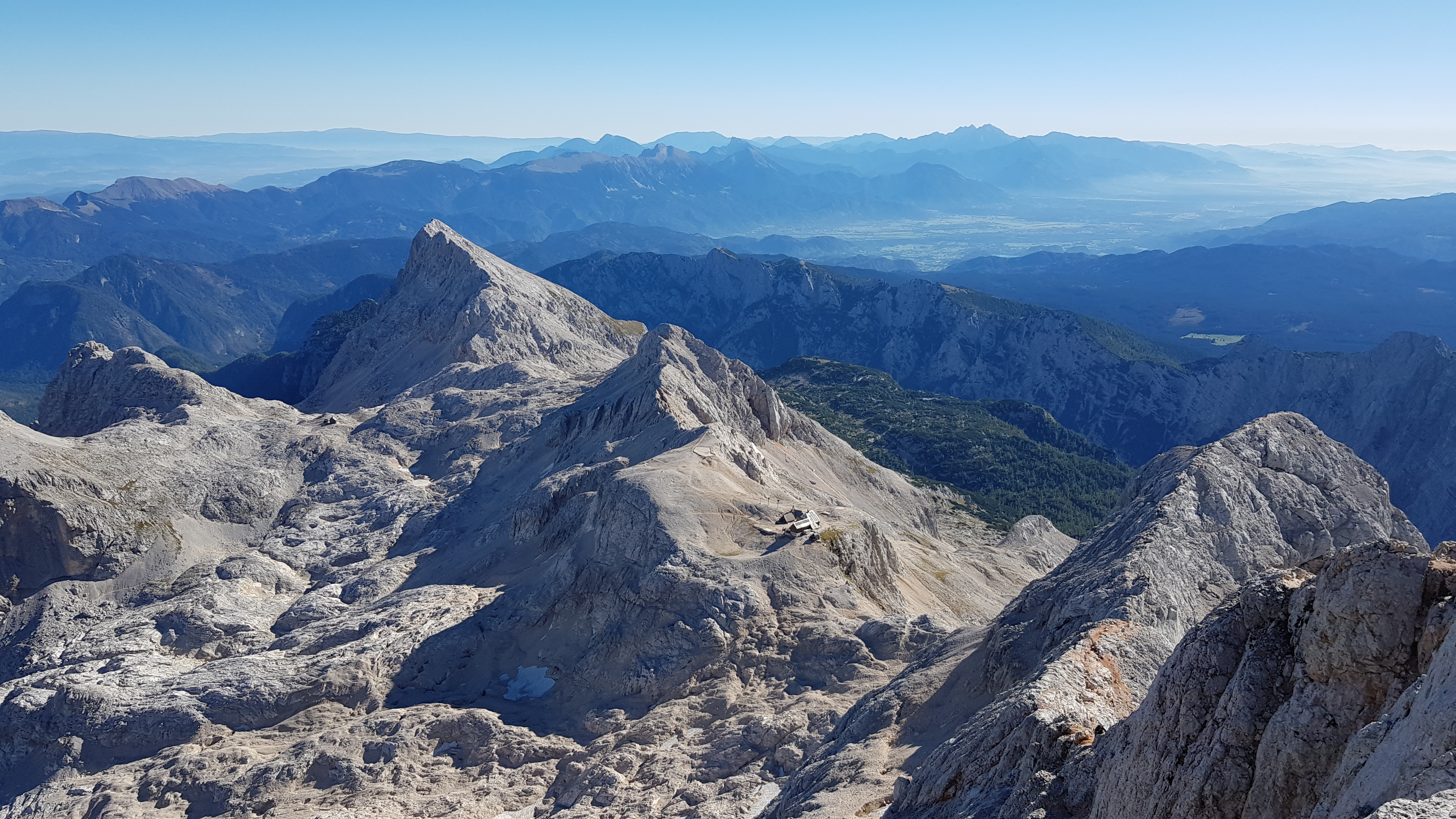 Less than 90 minutes from the hut to the top, we joined the happy Slovenians crowding onto their countries high point. All were happy to have English visitors on their mountain, many pointing out that we had unfortunately come on the wrong week; the famous summit turret had been taken away for restoration and was due back the next week. This tower is part of the Slovenian cultural heritage, erected in 1895 and surviving many storms and lightning strikes – providing shelter for those overnighting or caught in bad weather.