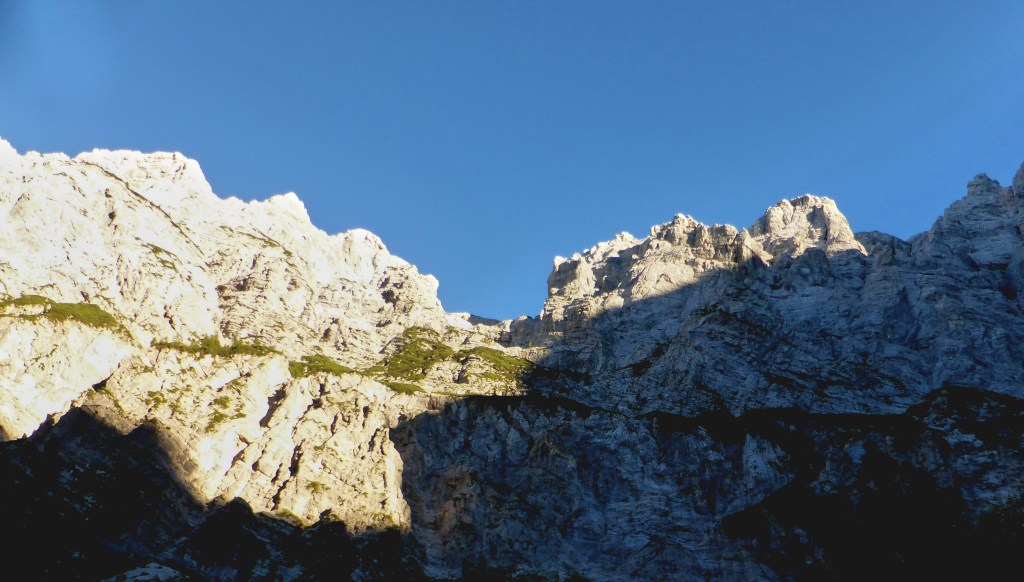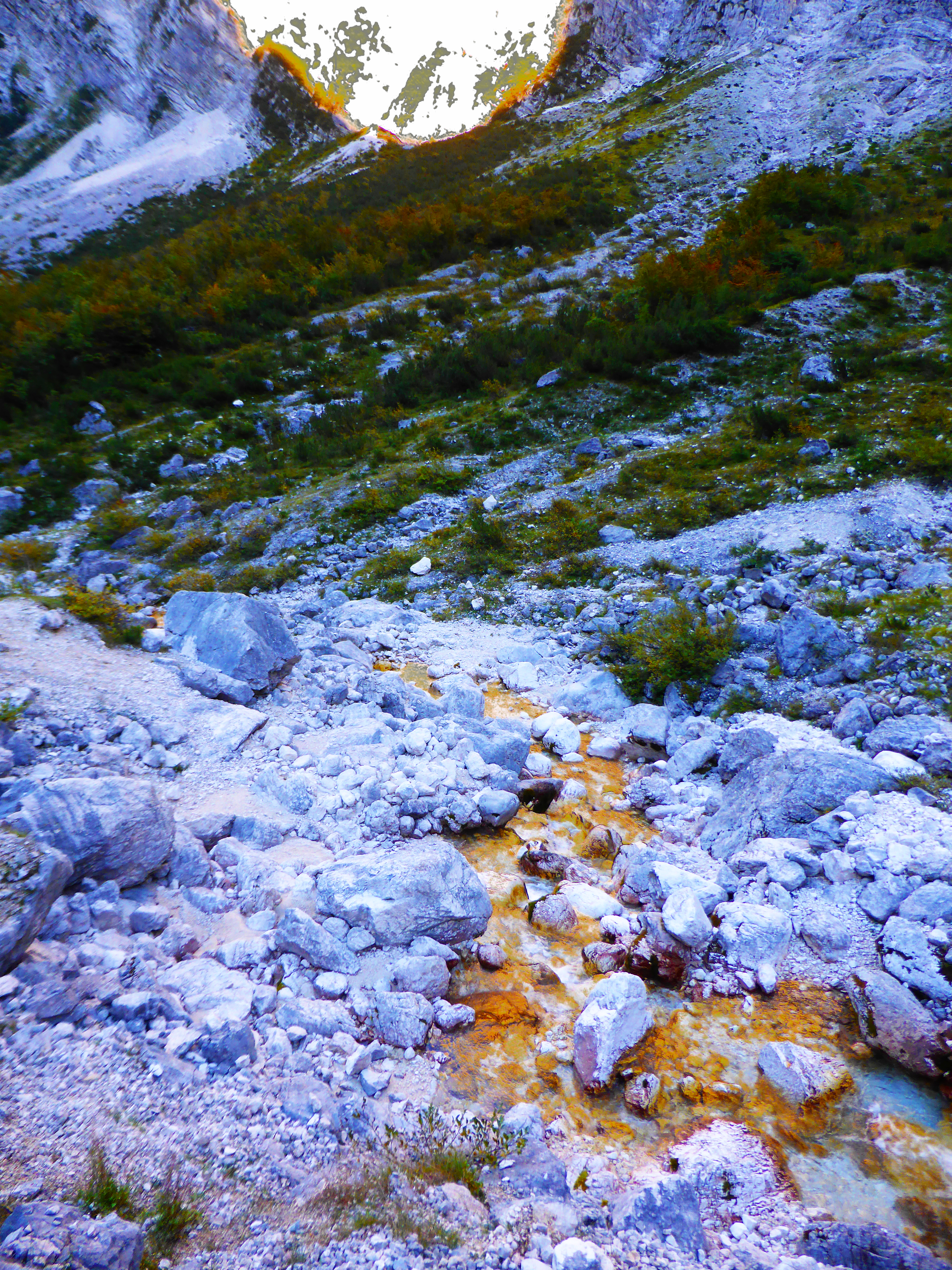 After a hard couple of hours climb down, the Prag path eased off and gently worked through the dwarf pines to meet the Luknja path coming down from the gap at the other side of the massive north face above us. Here we joined the River Bistrica. The sun was now below the level of the peaks opposite but caught the top of the main wall above us, giving the river a golden shimmer, difficult to capture on a photograph.